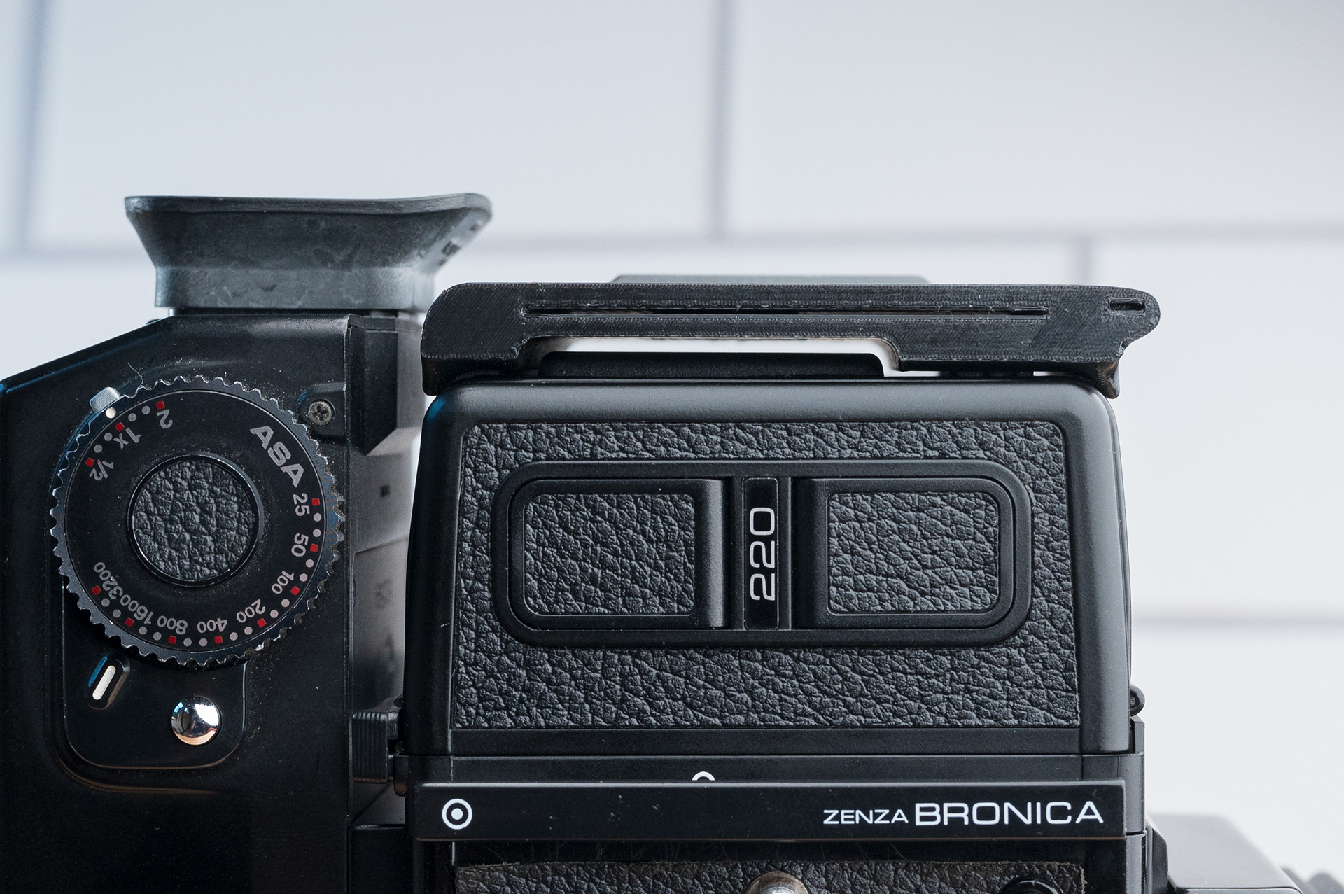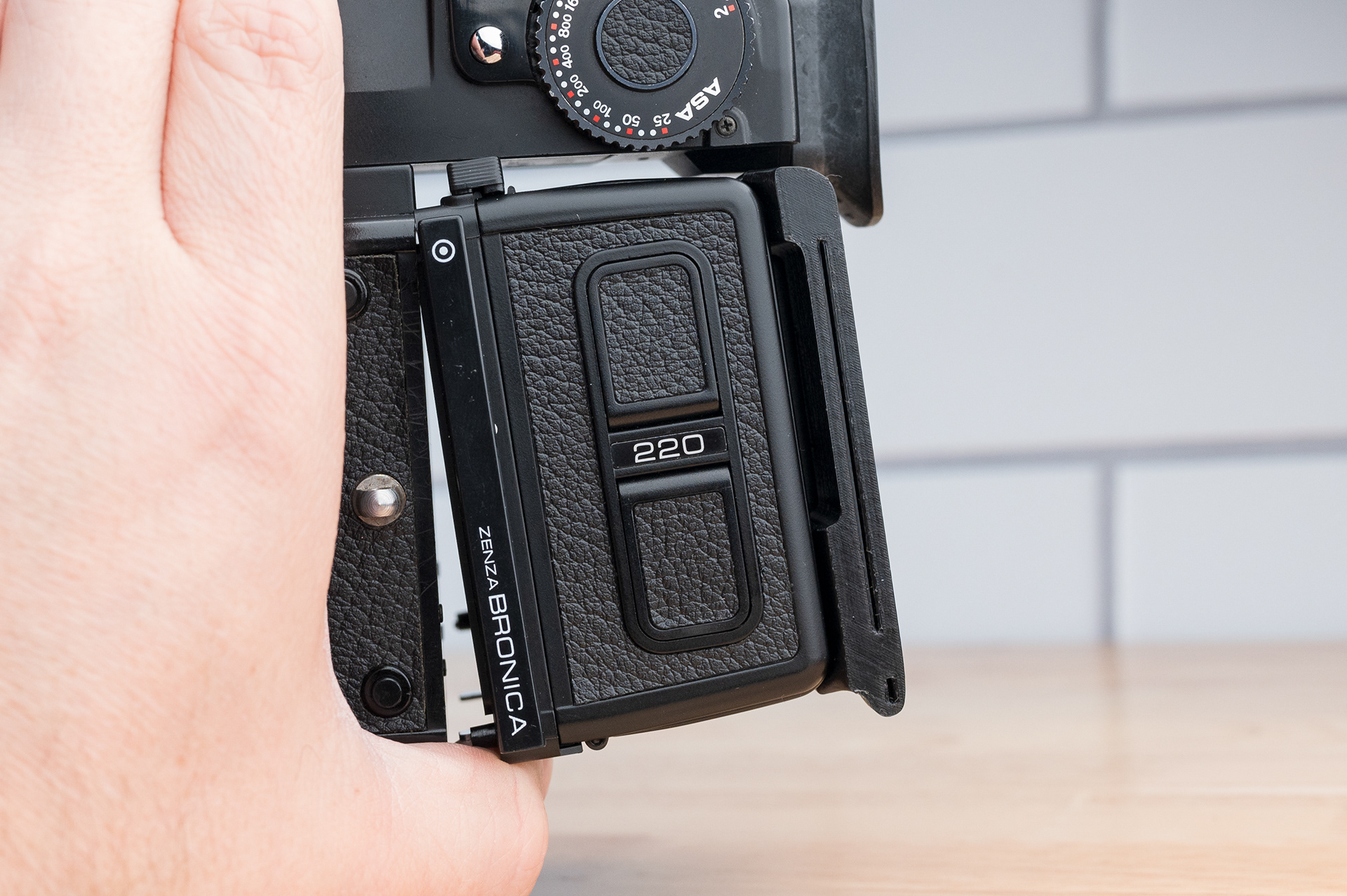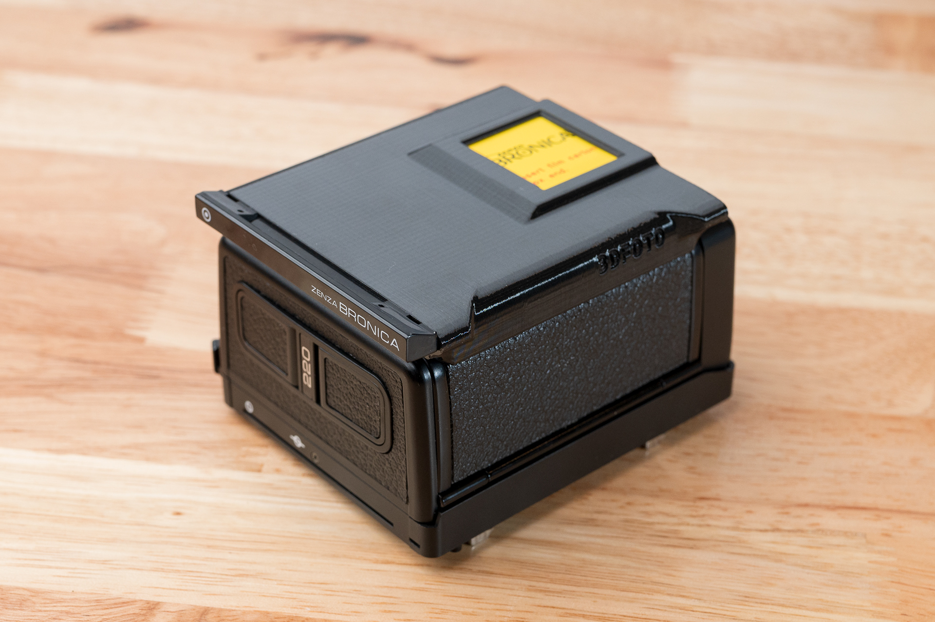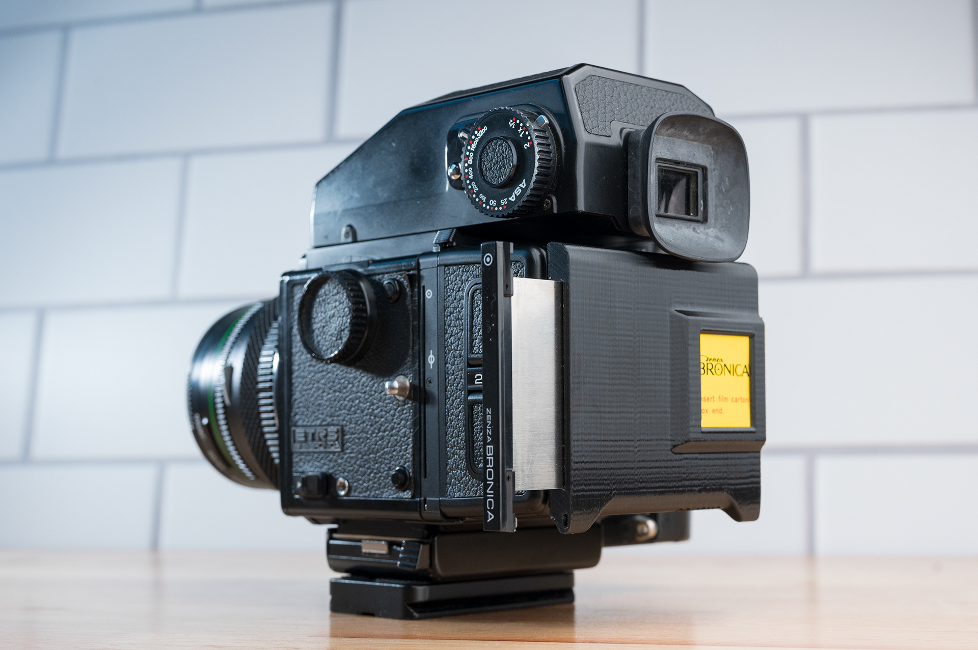 Like the Bronica SQ series, the ETR series has been long overdue for a more convenient dark slide storage solution. This dark slide holder solution adheres to the back of Bronica ETRĀ film backs using double-sided adhesive. It allows storage of the dark slide from either side and contains a memo holder for your film reminder. Slim design ensures backs can still be exchanged with the metered prism mounted. Printed using standard black PETG.