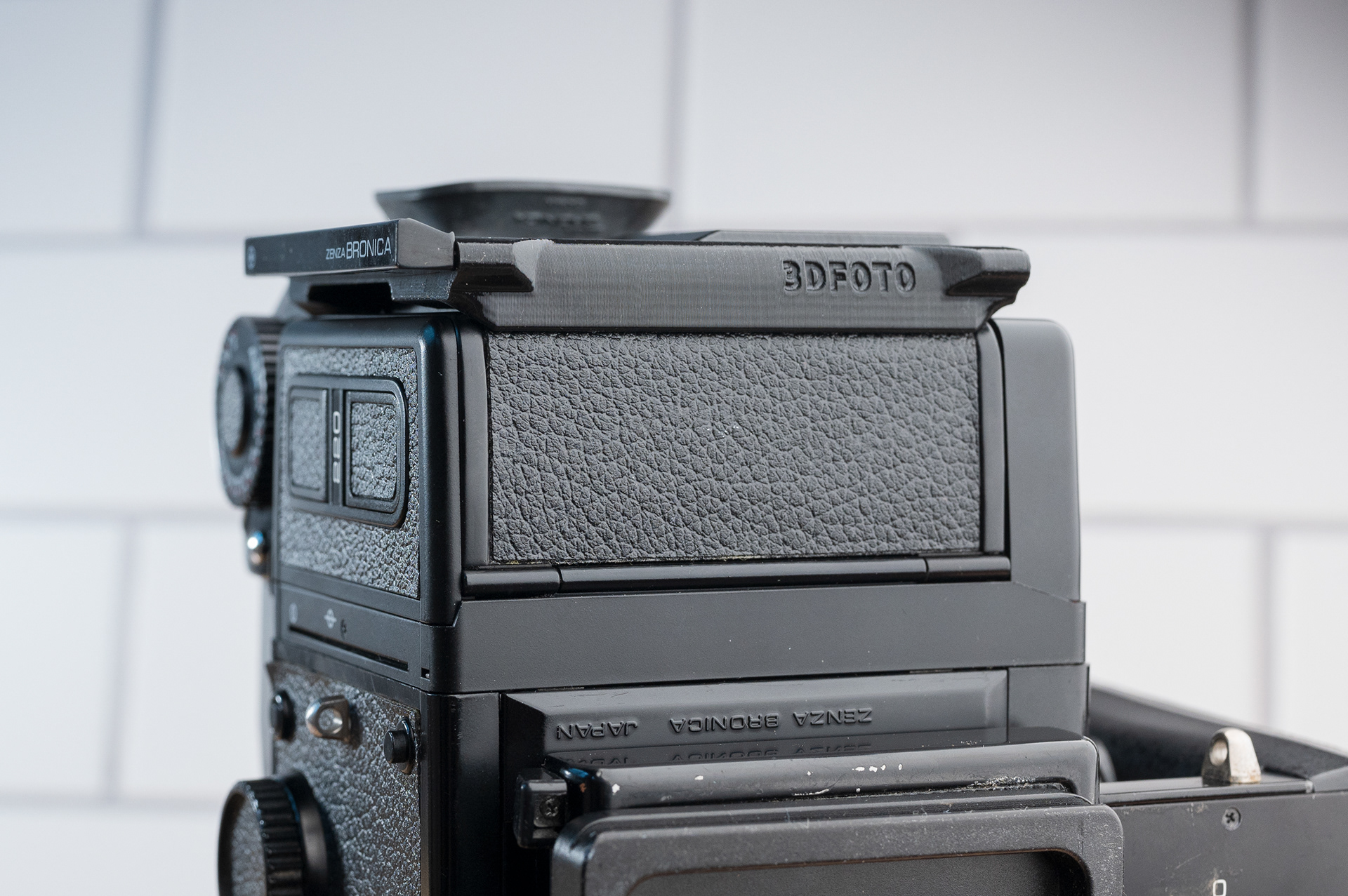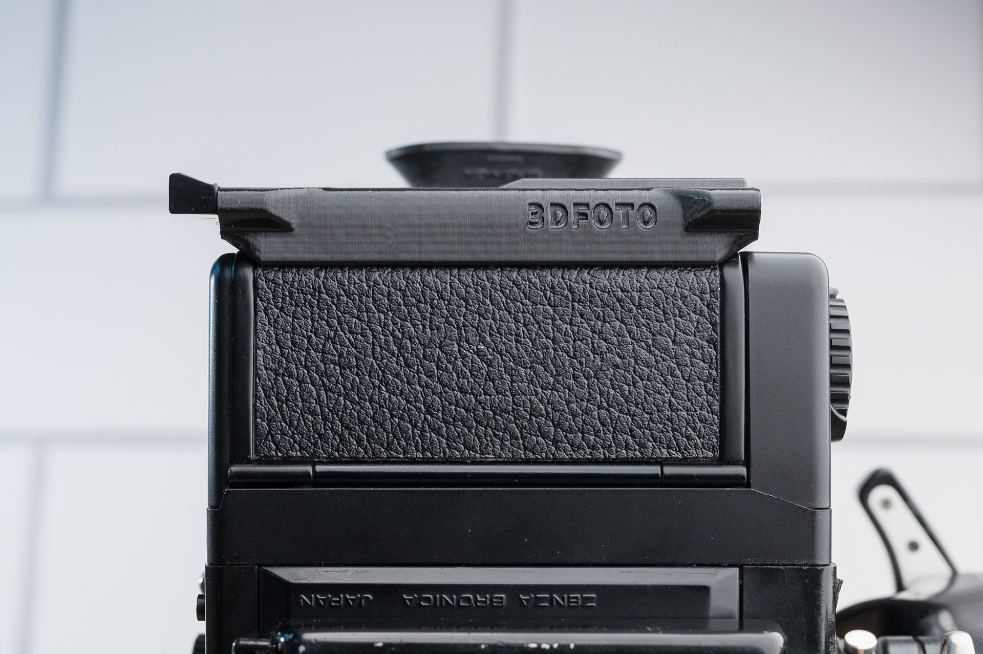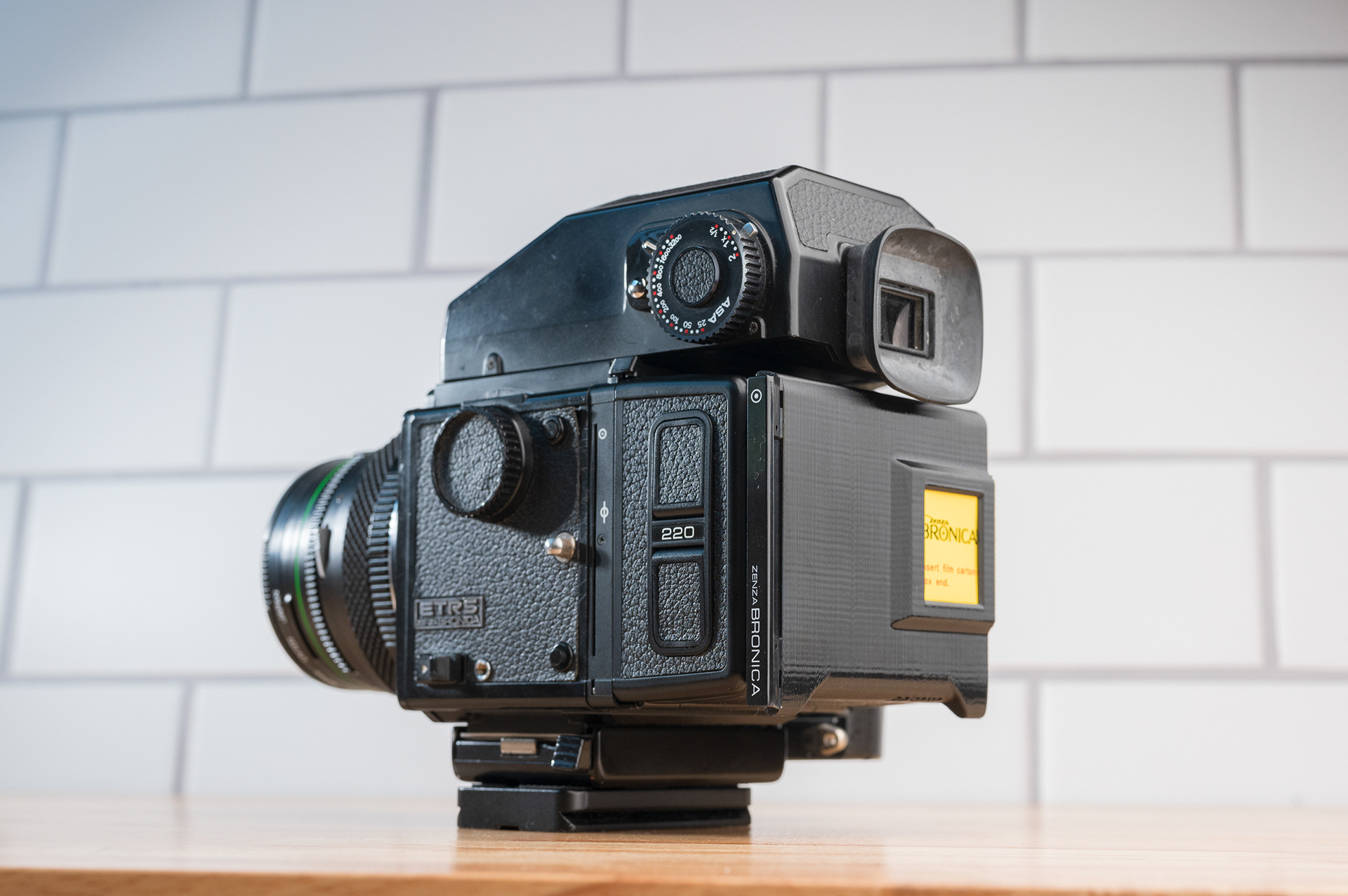 Like the Bronica SQ series, the ETR series has been long overdue for a more convenient dark slide storage solution. This dark slide holder solution adheres to the back of Bronica ETRĀ film backs using double-sided adhesive. It allows storage of the dark slide from either side and contains a memo holder for your film reminder. Slim design ensures backs can still be exchanged with the metered prism mounted. Printed using standard black PETG.