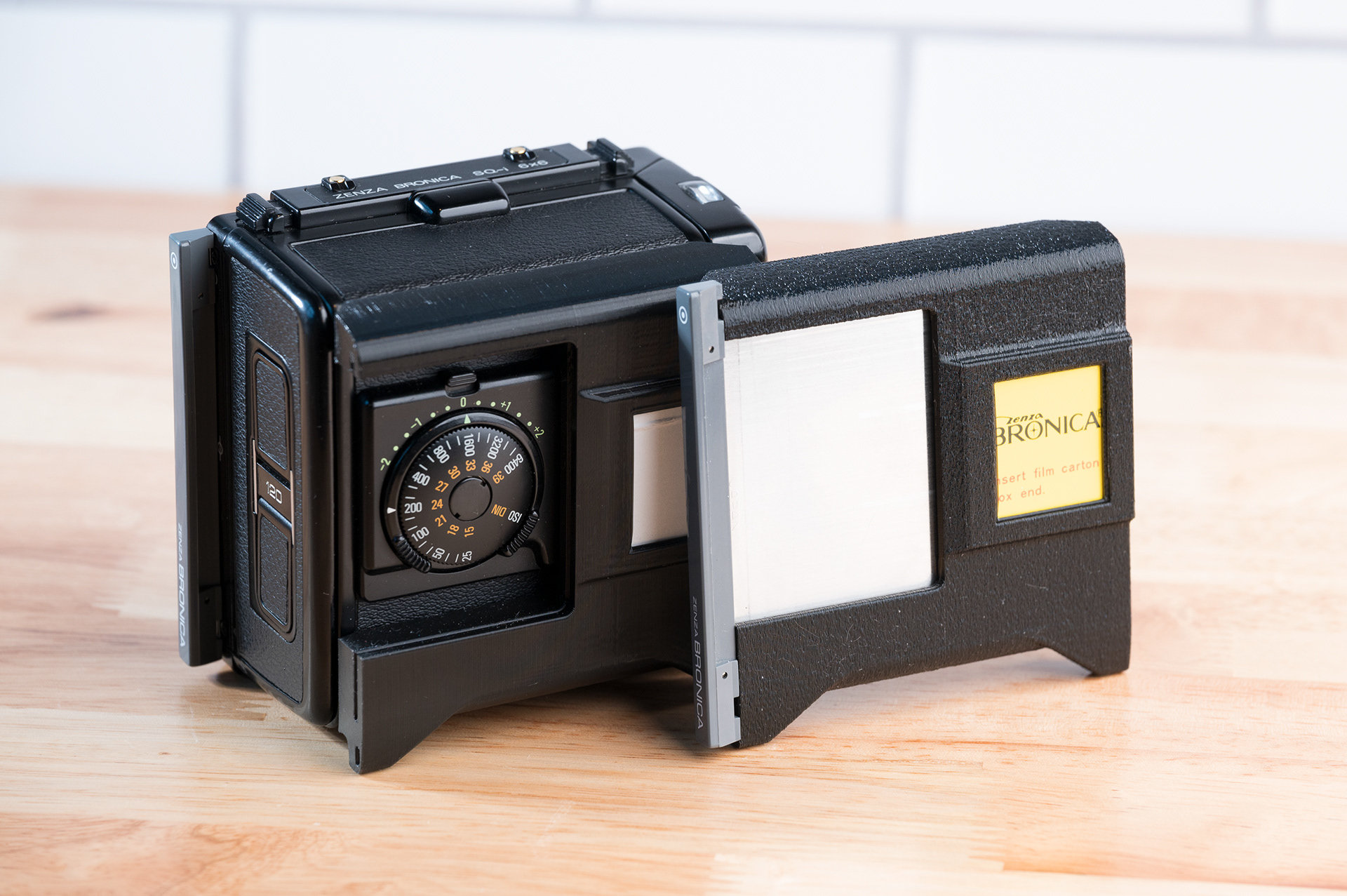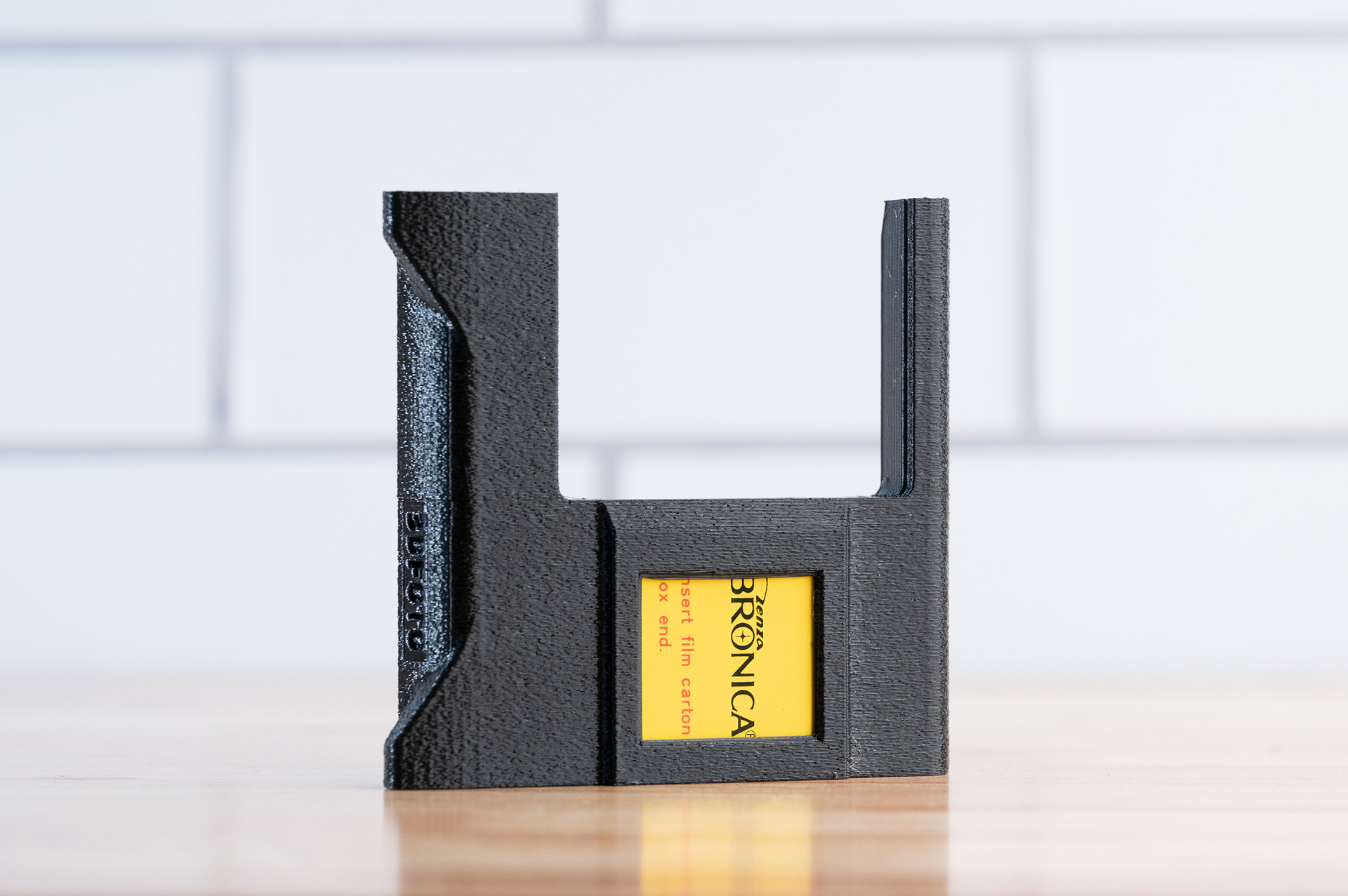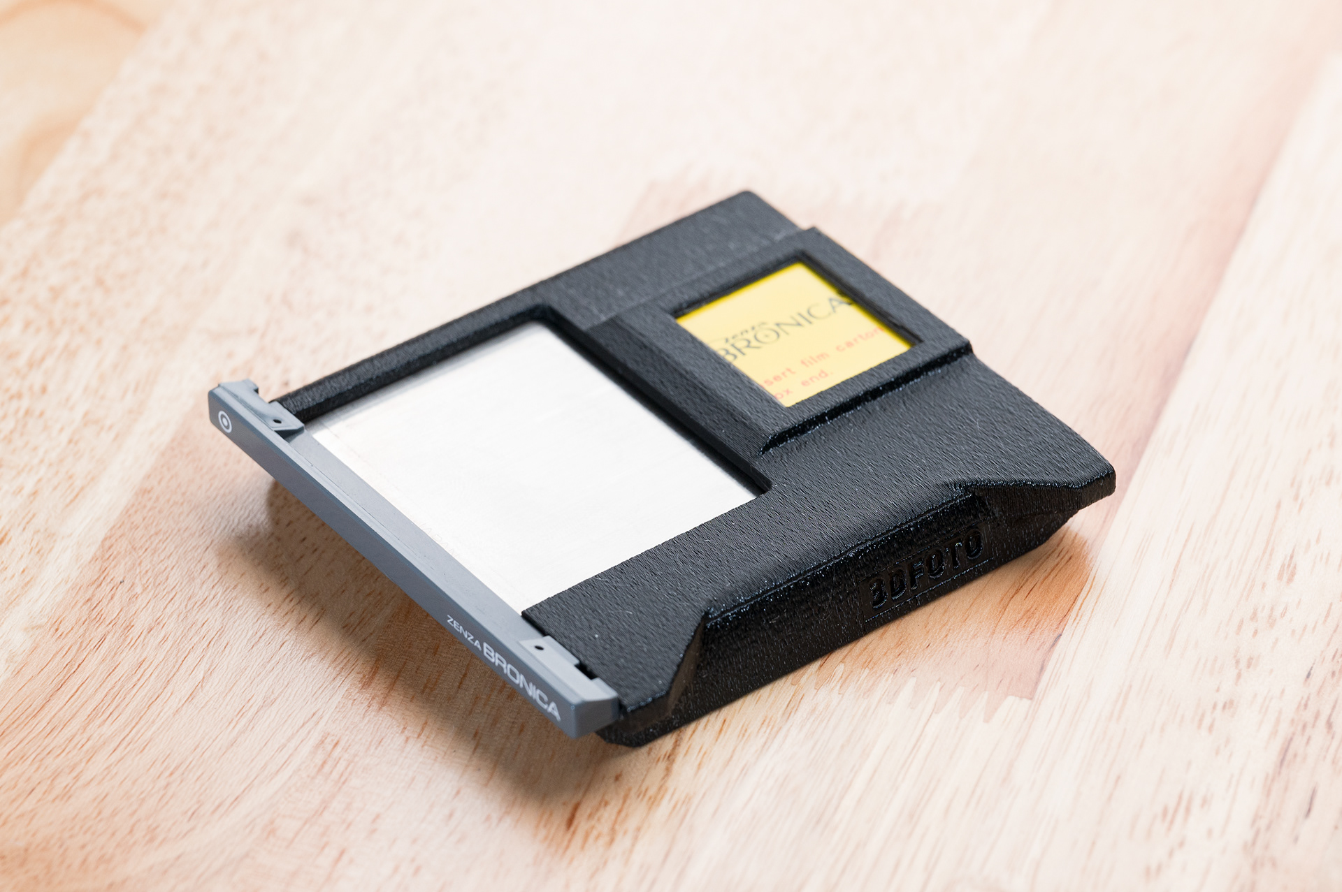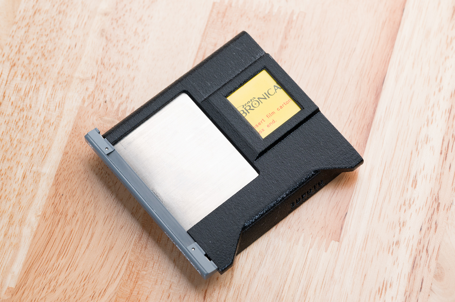 Finally, a place to put the dark slide other than your pocket or mouth while shooting with the Bronica SQ 6x6 system! This dark slide holder solution adheres to the back of Bronica SQ film backs using double-sided adhesive. It allows storage of the dark slide from either side and contains a memo holder for your film reminder. Additionally, with a dark slide holder attached, the SQ film backs can now stand up on their own. Printed using standard black PETG.