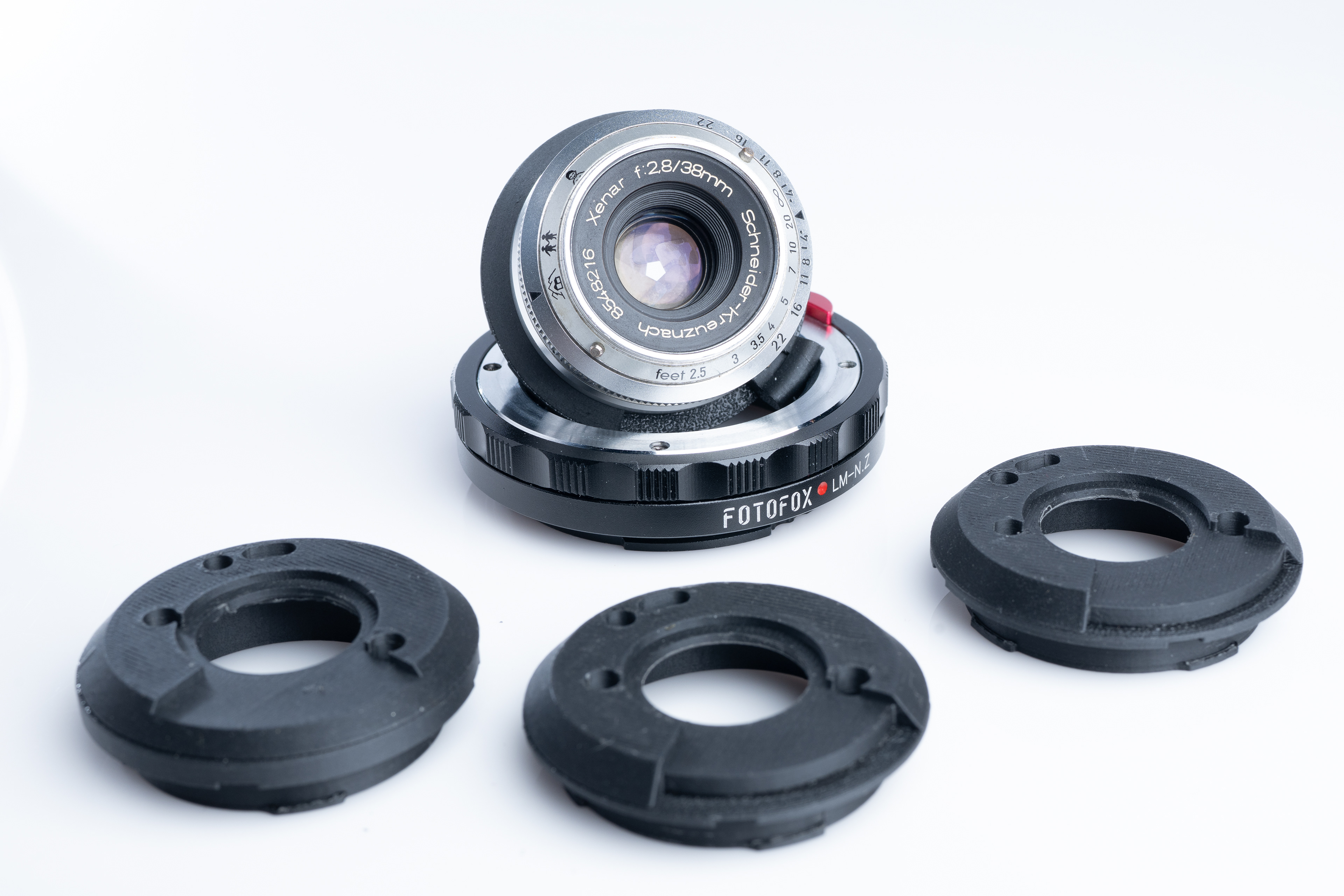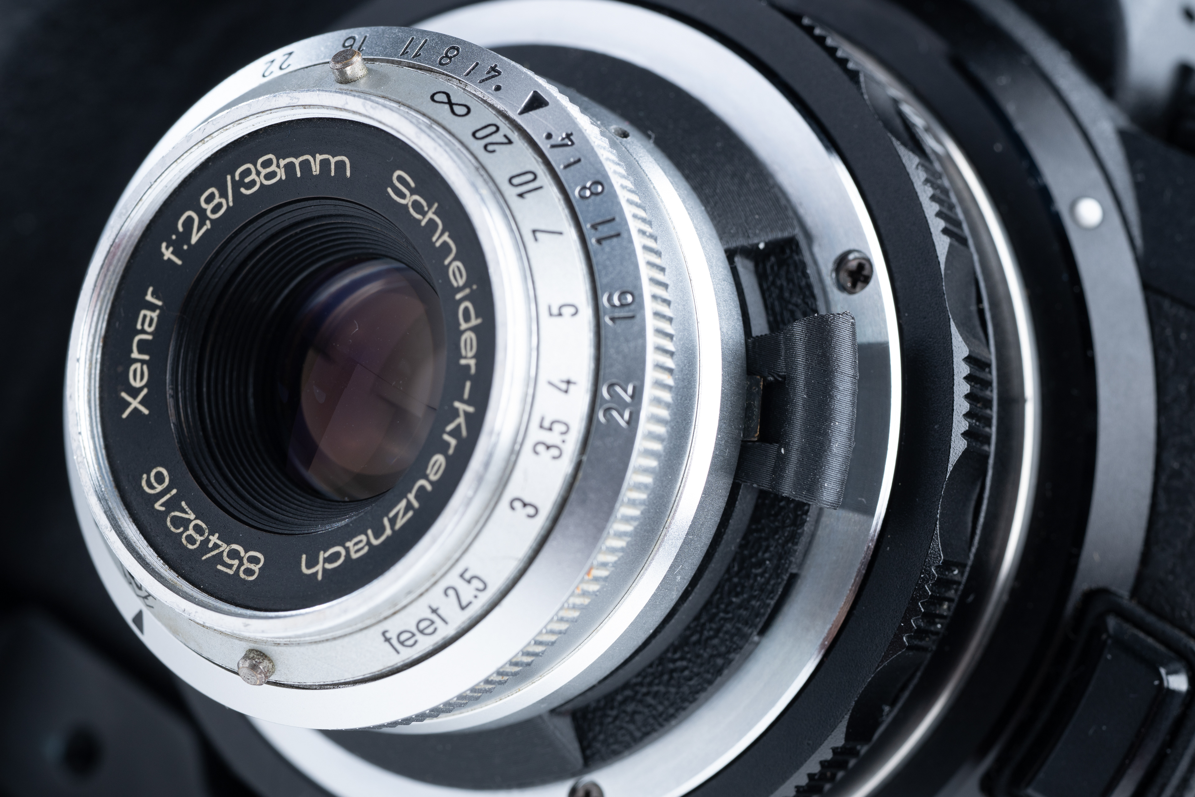 I'm not always a think-it-through type of person and on impulse, I picked up a Schneider Kreuznach 75mm f/5.6 Super Angulon and simultaneously began designing a mount. I wasn't exactly sure where to measure the lens' focal distance from as this lens does not appear to have the nodal point marked. So I wasn't certain where exactly everything would fall, once the assembly was complete. Hello iterative design.