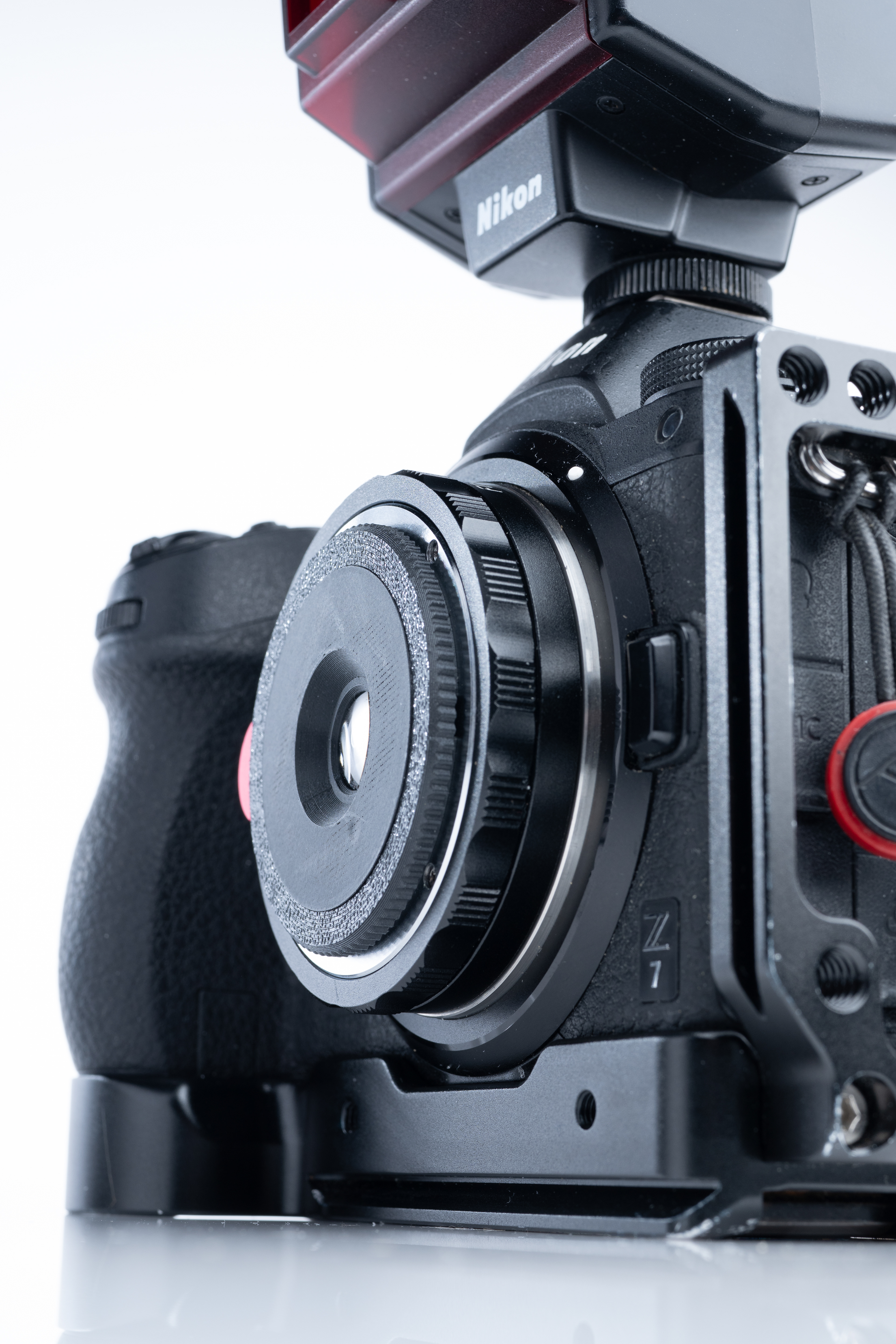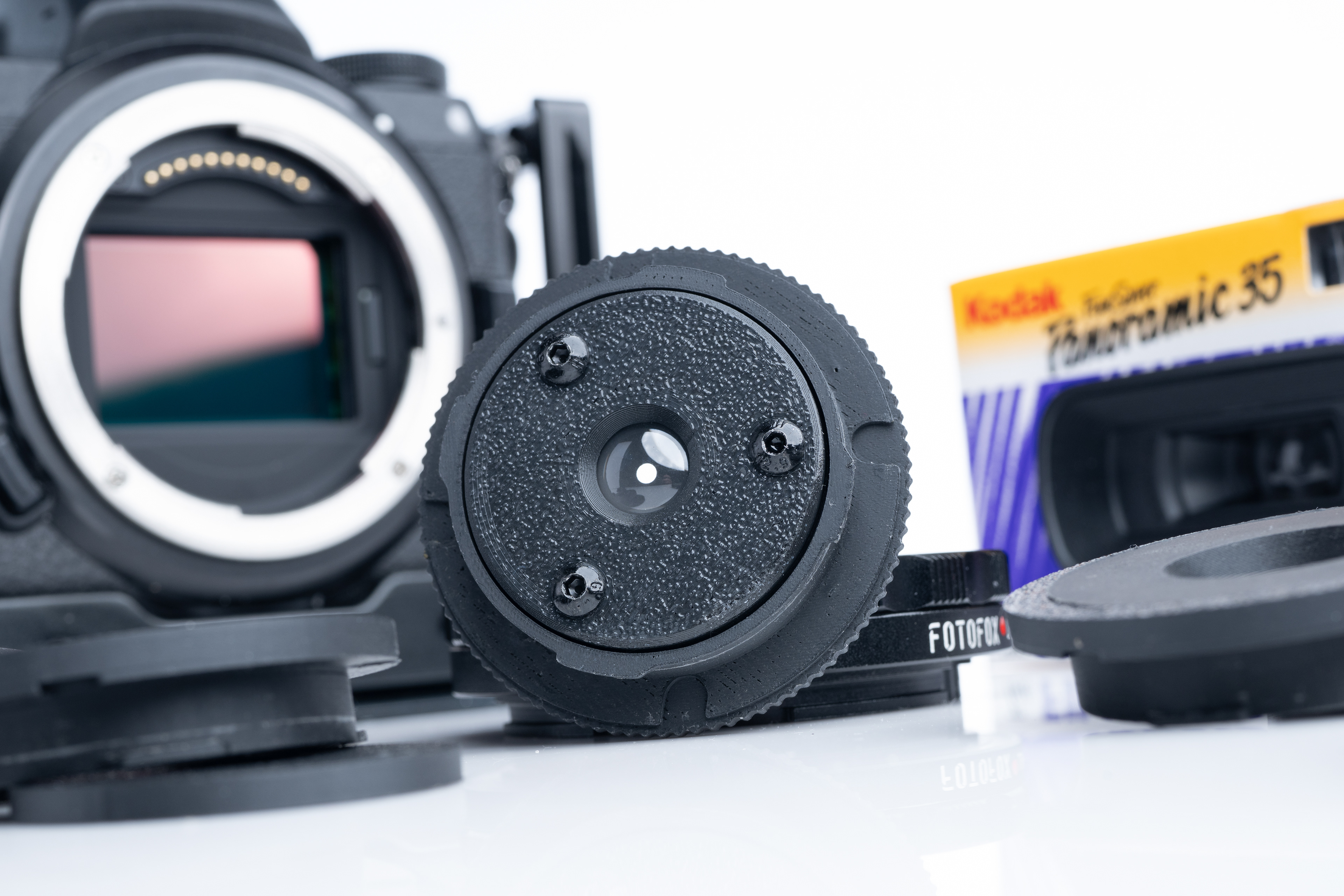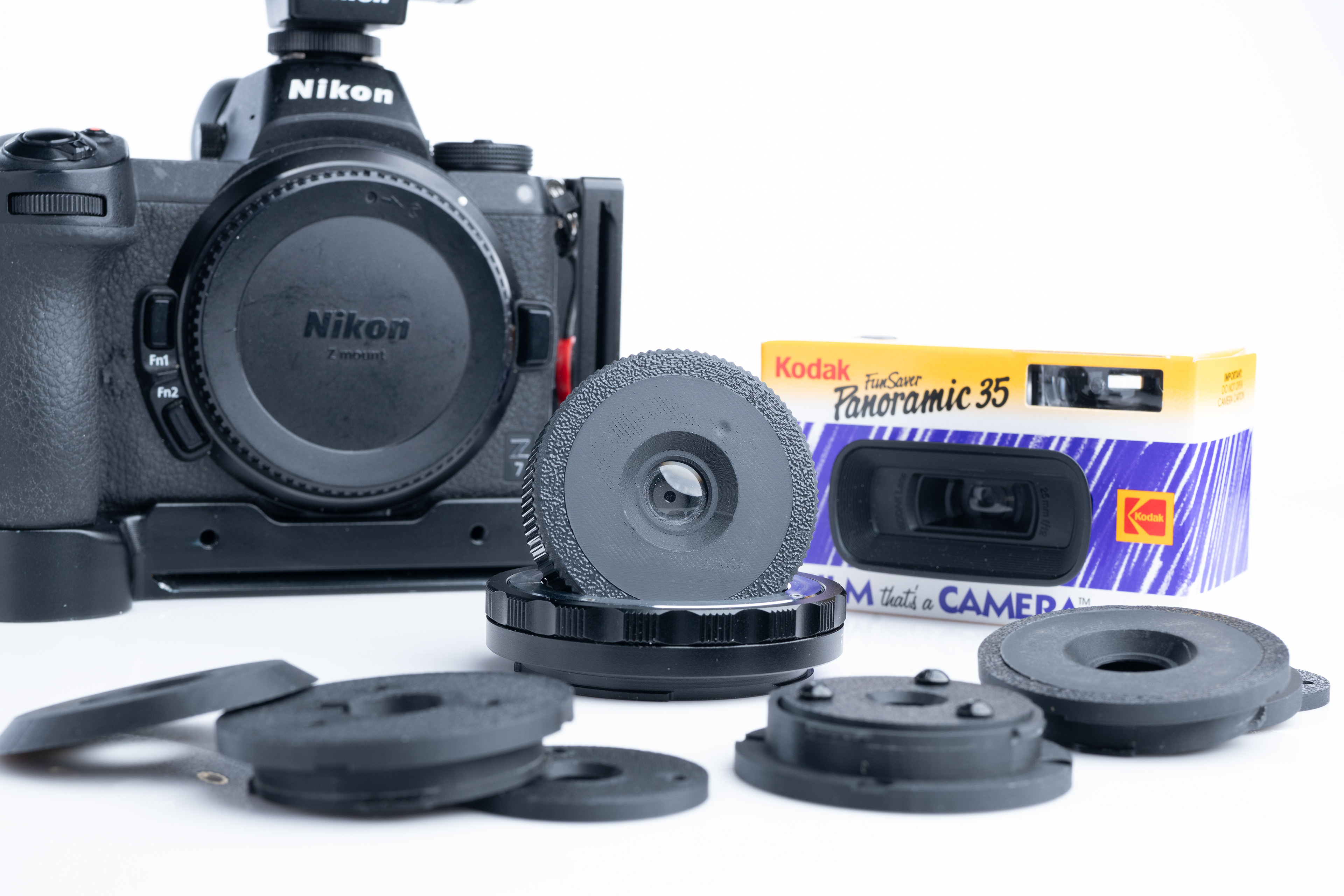 Kodak's 25mm f/12 lens from the FunSaver Panoramic (sort of, these cameras just crop the top and bottom of the standard 35mm frame for the aspect ratio). In any case, I removed the 2-element lens and iris, then replaced them into an M-mount 3-printed housing. I've shot it both in natural light as well as using an SB-20 flash unit for that 'party pic' look. Similar products already exist but sometimes it's just much more fun to do it yourself.
